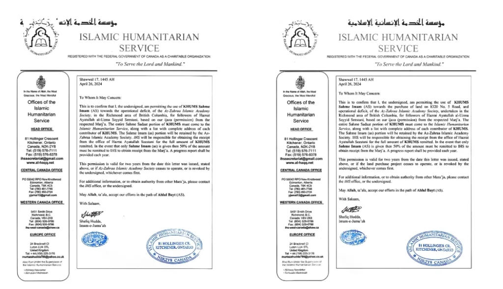 We are pleased to share that Az-Zahraa Islamic Academy Society has received Khums Ijazeh from Ayatullah al-Uzma Sistani, which allows members of our community to contribute their Khums to this noble cause. We are permitted to collect entire Khums while retaining Sahme Imam portion for this purpose and delivering the Sahme Sadaat portion to the Islamic Humanitarian Service. We are also permitted to collect Sahme Imam only. This endorsement is inshallah a blessing and will help us support the education of our children in the community.